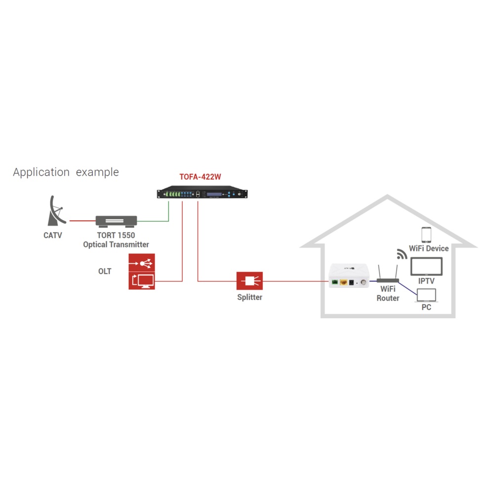 Die gesamte optische Ausgangsleistung kann 37 dBm erreichen. Die optische Leistung von 1550 nm pro Ausgangsport beträgt mindestens 19 dBm/22 dBm (optischer Leistungspegel wählbar) und ersetzt mehrere EDFA-Einheiten. Jeder Ausgangsport verfügt über integriertes CWDM zur Multiplexierung des CATV-Signals und des OLT-PON-Datenflusses, ideal für FTTH-Anwendungen. Der TOFA-422W bietet hervorragende Leistung und Zuverlässigkeit und unterstützt Netzwerkmanagement und Stromredundanz.
