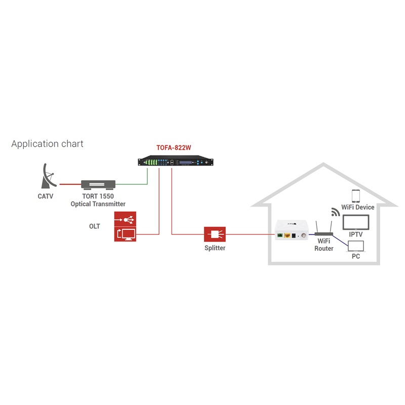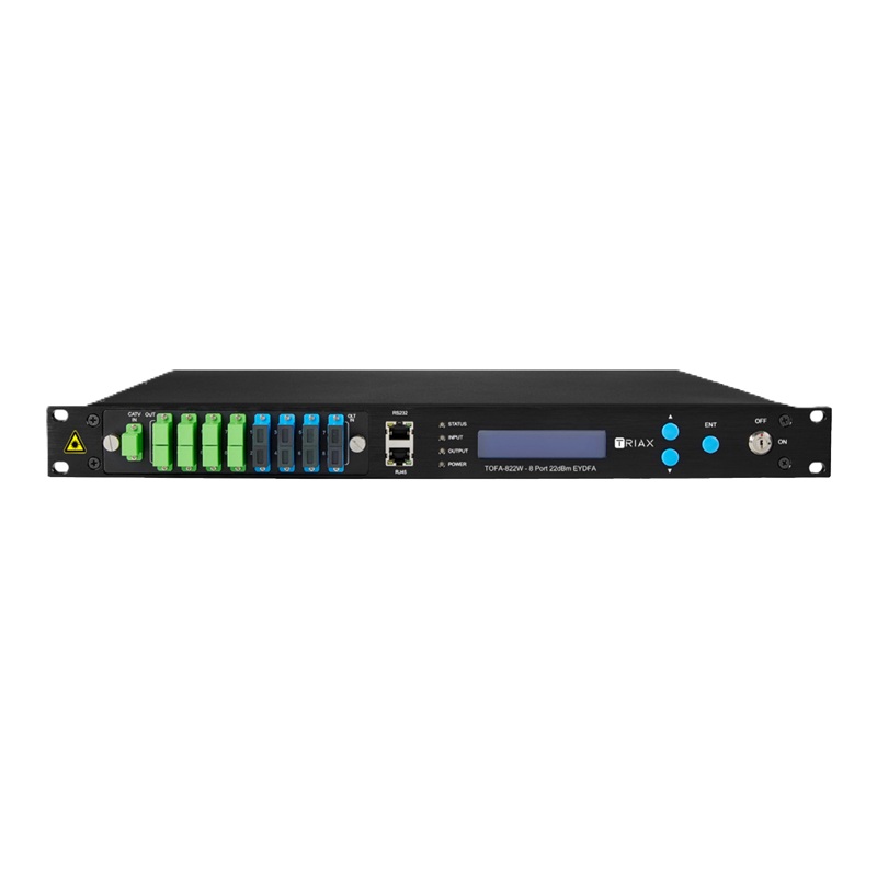Die gesamte optische Ausgangsleistung kann 37 dBm erreichen, die optische Leistung von 1550 nm pro Ausgangsport beträgt mindestens 19 dBm/22 dBm (optischer Leistungspegel wählbar) und ersetzt mehrere EDFA-Einheiten. Jeder Ausgangsport verfügt über integriertes CWDM zur Multiplexierung des CATV-Signals und des OLT-PON-Datenflusses, ideal für FTTH-Anwendungen. Der TOFA-822W bietet hervorragende Leistung und Zuverlässigkeit und unterstützt Netzwerkmanagement und Stromredundanz.