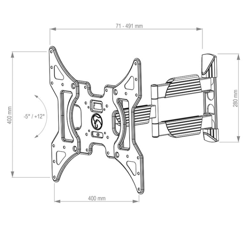 Die Bildschirmneigung kann montageseitig zwischen -5° und +12° angepasst werden. Der Wandabstand ist dank Drehgelenk variable zwischen min. 71 mm und max. 491 mm einstellbar. Zudem lässt sich die Halterung um max. ± 90° schwenken. Der genaue Winkel ist abhängig von der Breite des montierten Bildschirms.